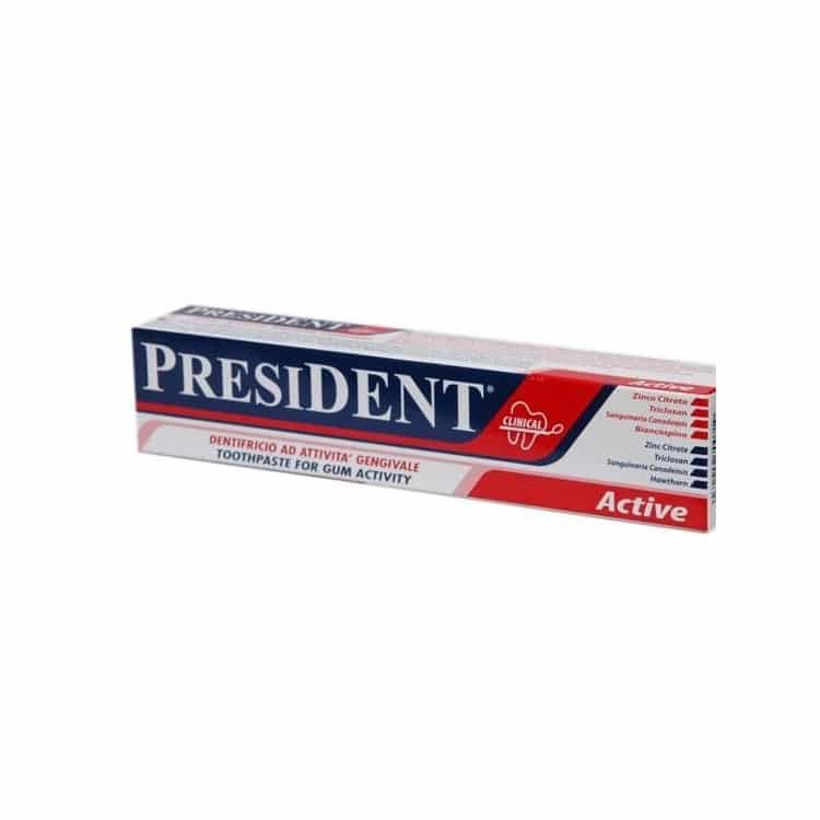 PresiDENT Active toothpaste is especially suitable for preventive gum treatment. It contains an ideally balanced dosage of triclosan, sodium fluoride, zinc citrate, extracts of sanguinaria canadensis and hawthorn. The paste has an optimal (mild) astringent effect on the gums. At the same time, it fights against the formation of plaque and tooth decay, suppresses the growth of bacteria and thus provides overall protection and relief for irritated gums. The paste foams and has a pleasant taste.